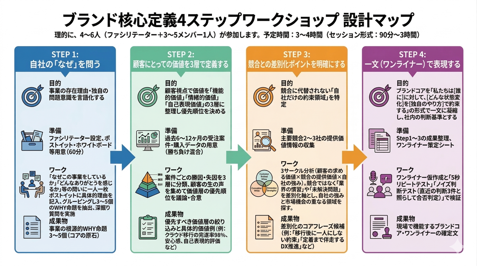 このプロセスは、ファシリテーター1名+経営陣・現場メンバー3〜5名の計4〜6名で実施するのが理想的です。所要時間の目安は3〜4時間(セッション形式の場合)。ワークショップ設計の実務例として、90分〜3時間のセッション形式が効果的とされています。(参考:Jade Agard Design「How to Run a Brand Strategy Workshop」|2026|ワークショップで扱う項目としてMission・Vision・Values・Positioning・Core Messagingを明記、推奨セッション長90分〜3時間)