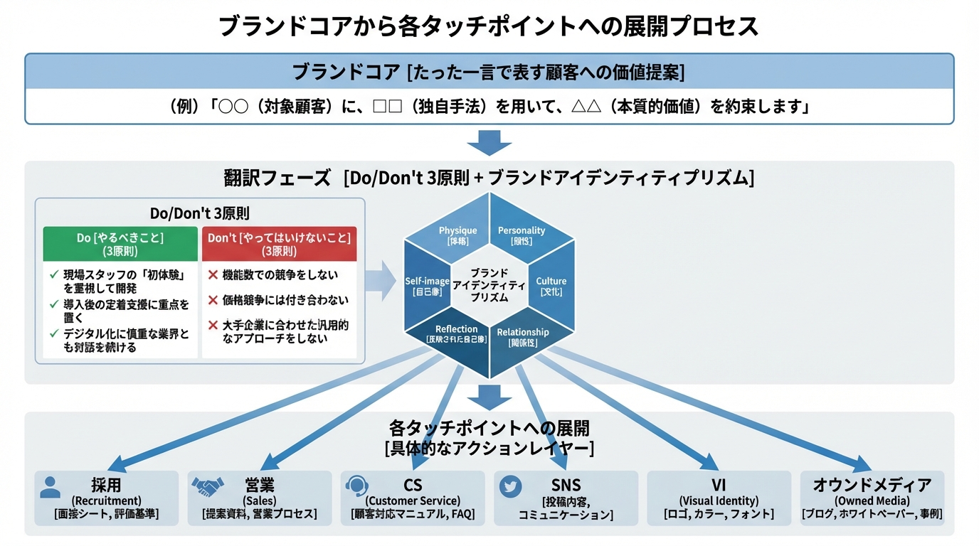 ブランドコアを定義しただけでは、それは「文書の中に眠る言葉」です。現場で機能させるには、コアを組織の各機能・各タッチポイントへ具体的に翻訳する必要があります。