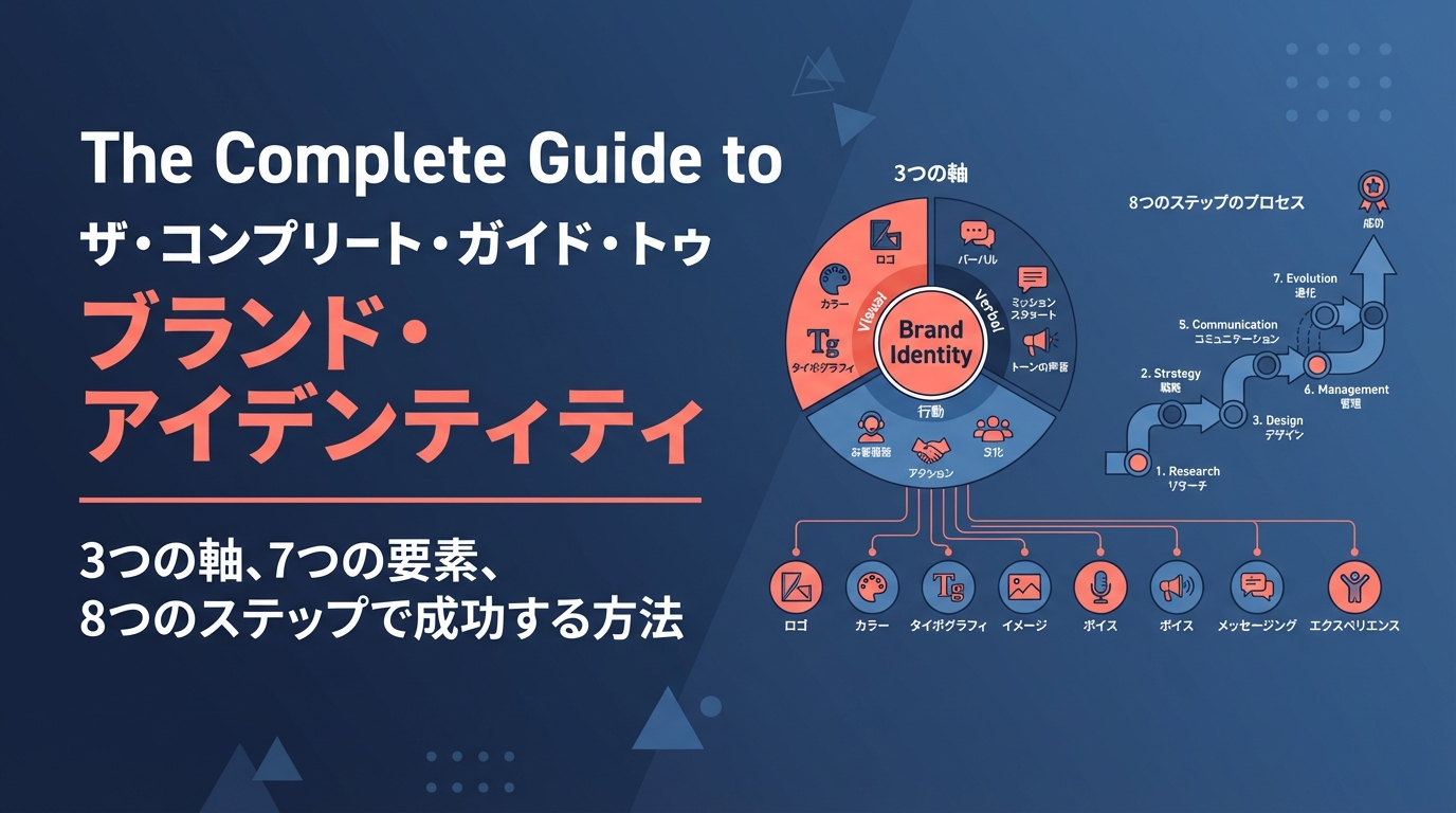 ブランドアイデンティティは、送り手側が定義する「どう見られたいか」の設計図です。3軸(ビジュアル・言語・行動)と7要素を、8ステップで実装していきます。