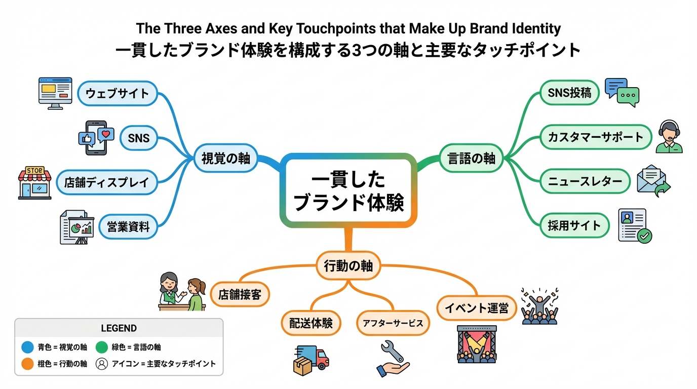 ブランドアイデンティティは、ビジュアル(見た目)/言語(声・メッセージ)/行動(体験・オペレーション)の3軸で構成されます。