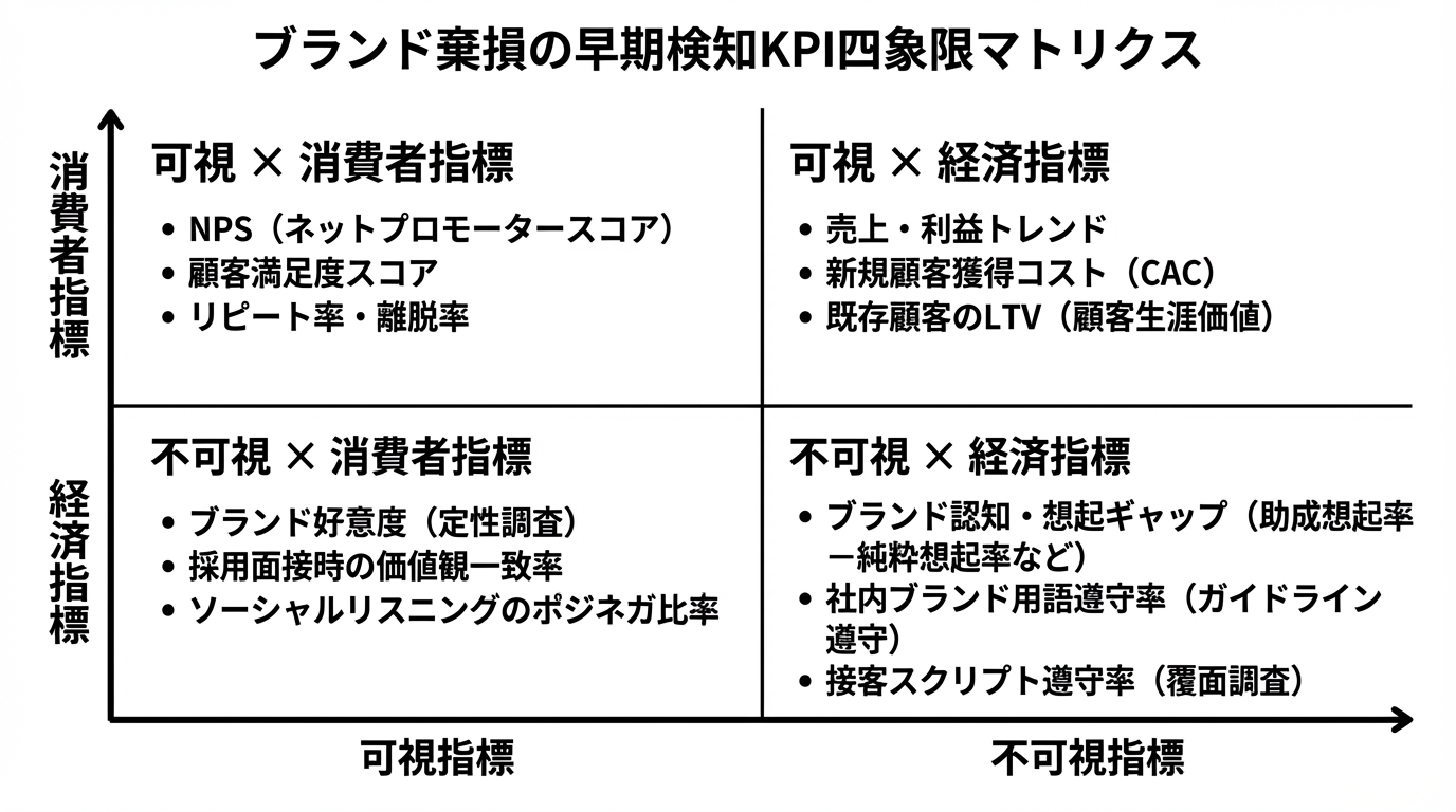 失敗を早期に検知するためのKPI設計が重要です。ブランド評価は「経済的指標/消費者指標」×「見える指標/見えない指標」の二軸で整理できます。