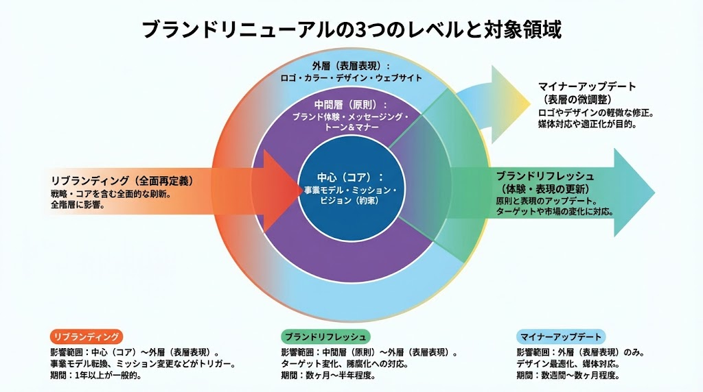 実務においては、リニューアルを大きく3つのレベルに分けて考えると判断が整理されます。その影響範囲は、ブランドの核心から表面的な表現まで階層的に捉えることができます。