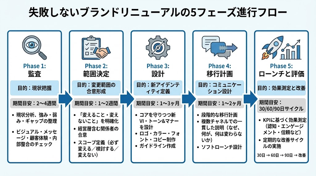 「やる」と決断したら、次は「どう進めるか」です。ブランドリニューアルの失敗の多くは、設計の失敗ではなく「順序の誤り」か「移行の雑さ」から生まれます。デザインを先に作って後から戦略を考えたり、社内決裁を取らずに発表したりするのが典型的なパターンです。