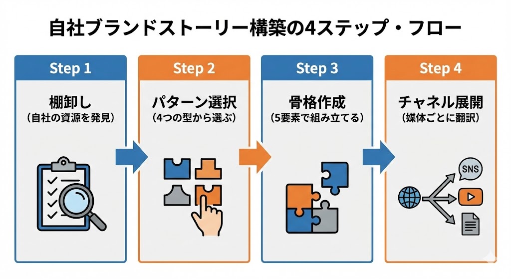 ここまで15事例と4パターンを見てきました。では、これを自社のブランドストーリーにどう落とし込むか。4つのステップで整理します。