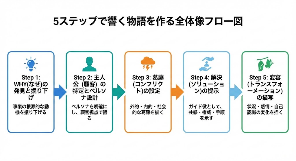 ここまで、ブランドストーリーの作り方を5つのステップでお伝えしてきました。最後に、重要なポイントを整理します: