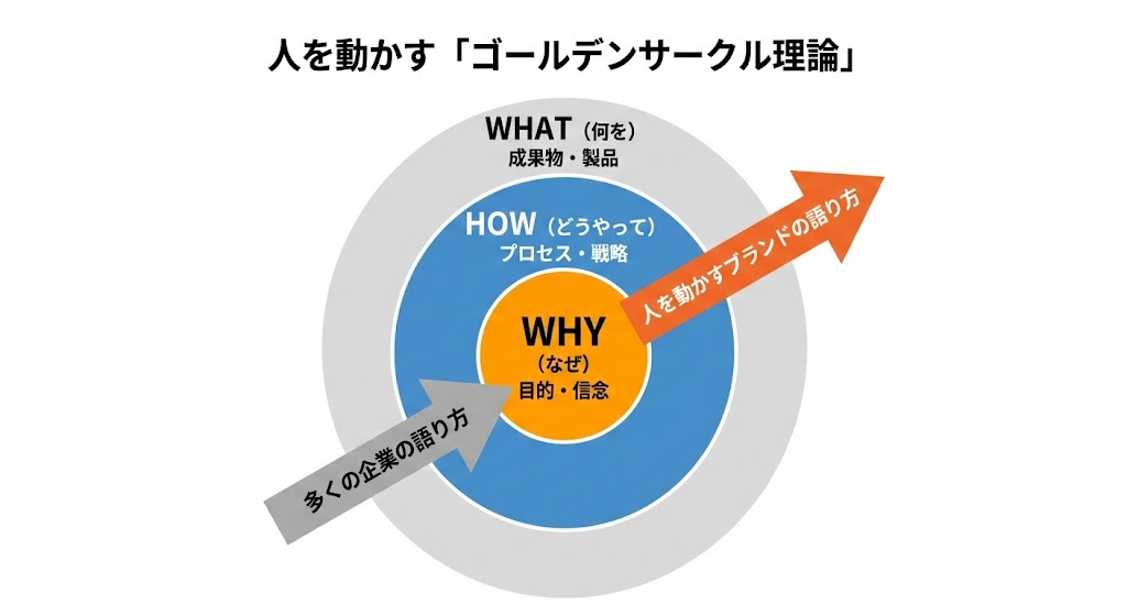 この考え方は、サイモン・シネックが提唱した「ゴールデンサークル理論」として広く知られています。ゴールデンサークル理論は、Why(存在意義・目的)を中心に据え、How(それを実現するプロセス・価値・戦略)、What(外部に見える製品やサービス)へと広がる三層構造として説明されます(参考:University of Illinois「Golden Circle Leadership Template」|2025|WHYは「組織の存在理由・目的・信念」、HOWは「プロセス・戦略・手法」、WHATは「成果物・サービス・製品」)。多くの企業は「何を(What)」や「どうやって(How)」から語り始めますが、人を動かすブランドは必ず「なぜ(Why)」から語り始めます。