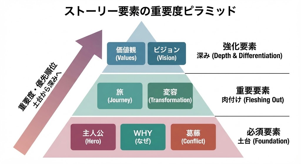 こうした悩みの本質は、ストーリーの構成要素がわかっていないことにあります。主人公が曖昧だったり、WHY(なぜ始めたか)がぼんやりしていたり、葛藤がなかったり、ビジョンで終わっていなかったり—要素が欠けているから、どれだけ「良い話」でも伝わらないんです。