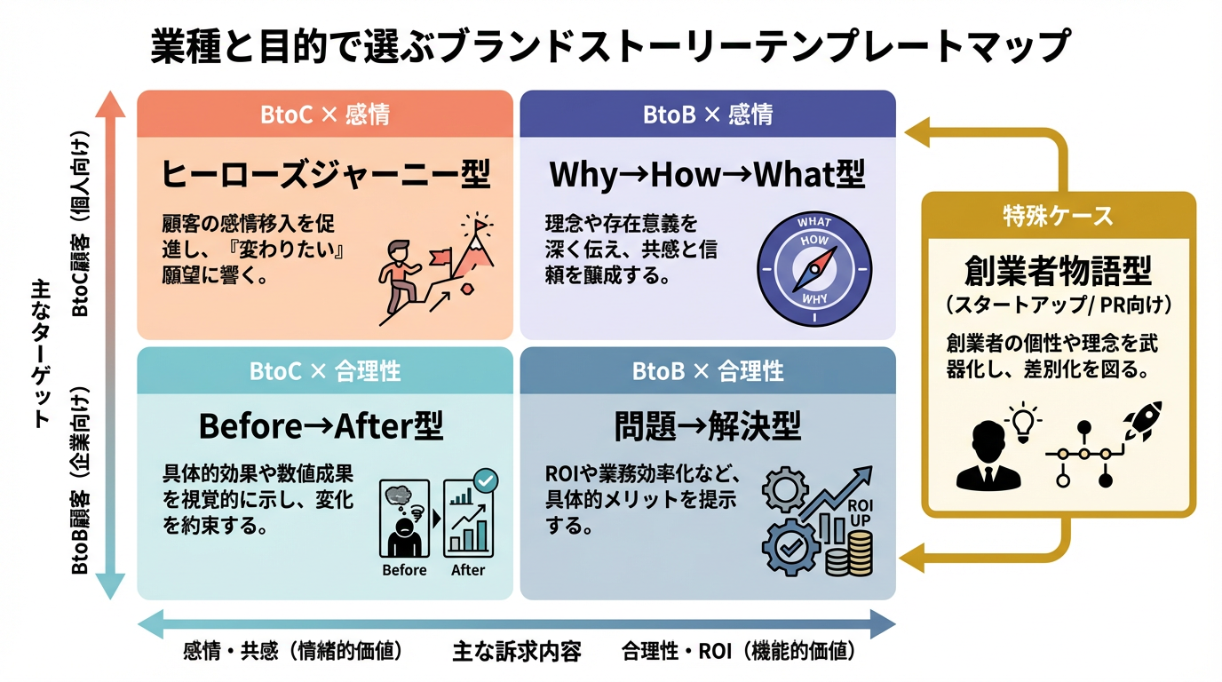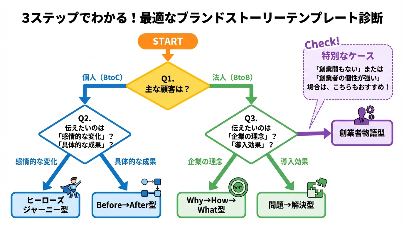 2. 業種・目的・資産に合わせて1〜2型を選択:BtoCならヒーローズ、BtoBなら問題→解決、スタートアップなら創業者物語といった具合に、自社に最適な型を見極める