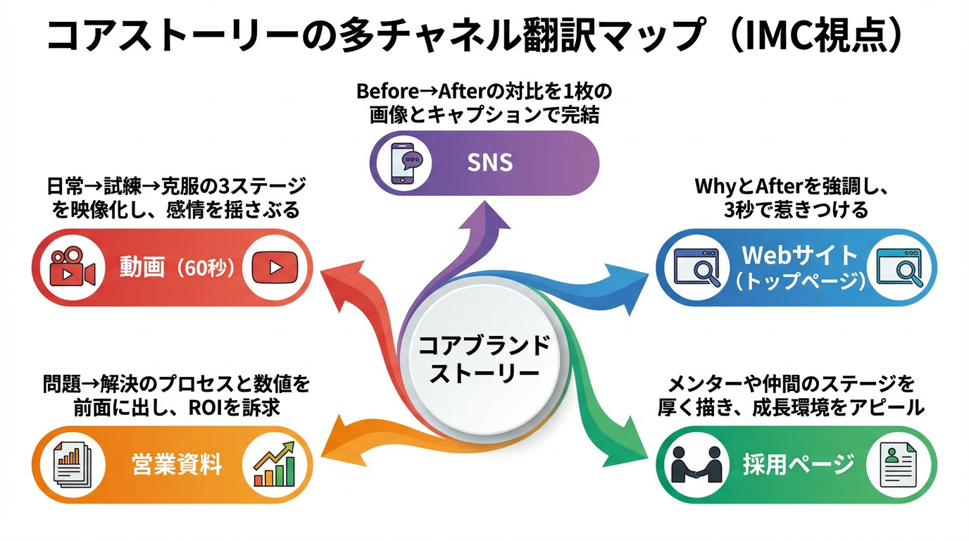 4. IMCでチャネル翻訳:1つのコアストーリーを、サイト/採用/営業/動画/SNSに再構成し、一貫性を保ちながら最適化