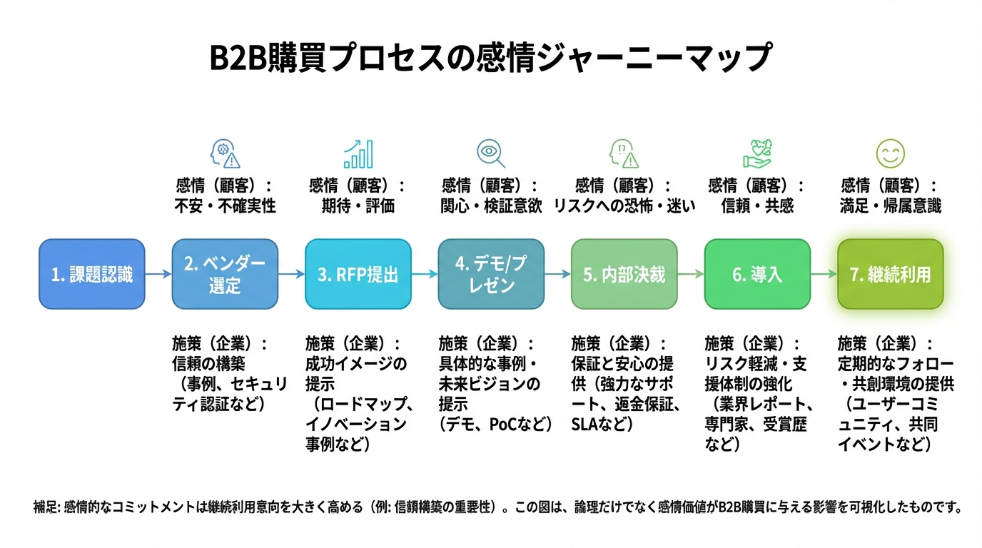 それでは、まずBtoBにおける感情の役割について、その実態から見ていきましょう。なお、本記事で紹介する事例は、一般公開情報に基づく編集部の分析であり、各企業の公式見解ではない点にご留意ください。成果データも一次情報もしくは信頼性の高い二次情報のみ出典を明記しています。