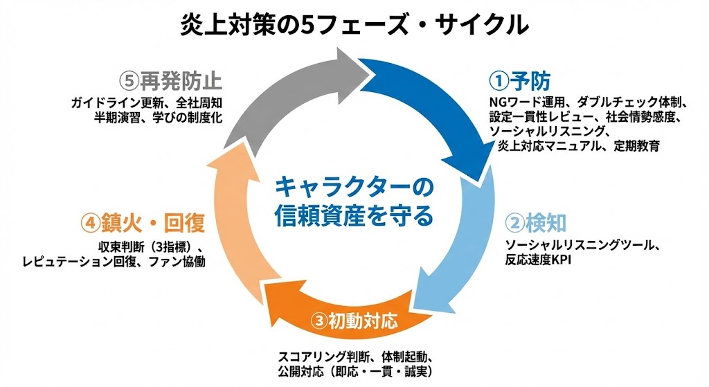 キャラクター炎上対策は、「予防→検知→初動→鎮火→再発防止」という5段階のプロセスで体系化できます。