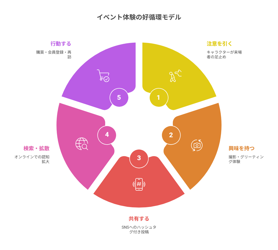 イベントにおける来場者の行動は、マーケティングの『AISASモデル』で整理すると理解しやすくなります。Attention(注意を引く)、Interest(興味を持つ)、Search(検索する)、Action(行動する)、Share(共有する)の流れです。キャラクターは最初の『Attention』で絶大な効果を発揮し、撮影体験が『Interest』を喚起、その後のハッシュタグ検索やSNS投稿が『Search』と『Share』を促し、最終的な購買や登録といった『Action』に繋げる。この一連の流れを設計することが、イベント成功の鍵となります。