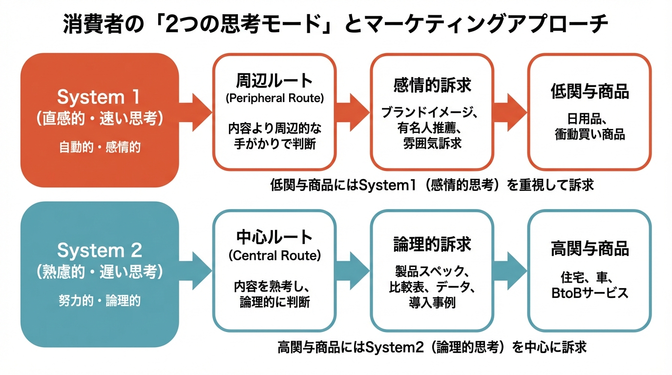 実務的に重要なのは、高関与商品と低関与商品で、System1/2やELMの中心ルート/周辺ルートへのアプローチ配分を変えること。高関与商品では比較表や導入事例でSystem2と中心ルートに訴え、低関与商品では直感的な印象訴求や雰囲気でSystem1と周辺ルートを重視する、という設計が効果的です。System1/2理論とELMの関係性を整理すると、次の図のようになります。