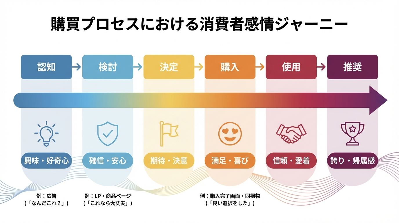 消費者の購買プロセスを感情の観点から捉え直すと、以下のような「感情ジャーニー」が見えてきます。