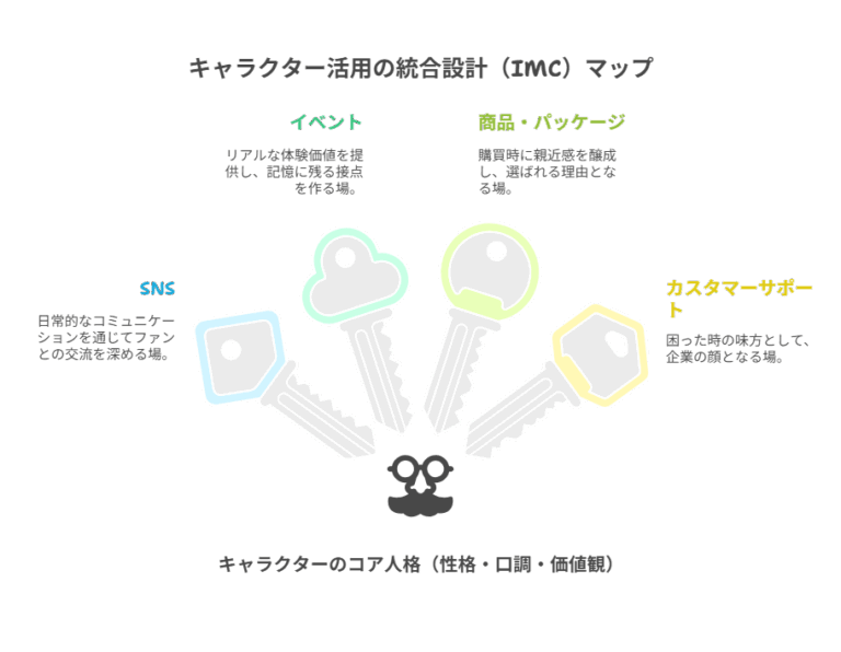 ブランディングの基本理論に「統合型マーケティングコミュニケーション(IMC)」という考え方があります。これは、簡単に言えば「チャネルごとに表現方法は変えても、根底にある人格や価値観は絶対にブレさせない」というアプローチです。上の図が示すように、これをキャラクター活用に応用することが、成功への第一歩となります。