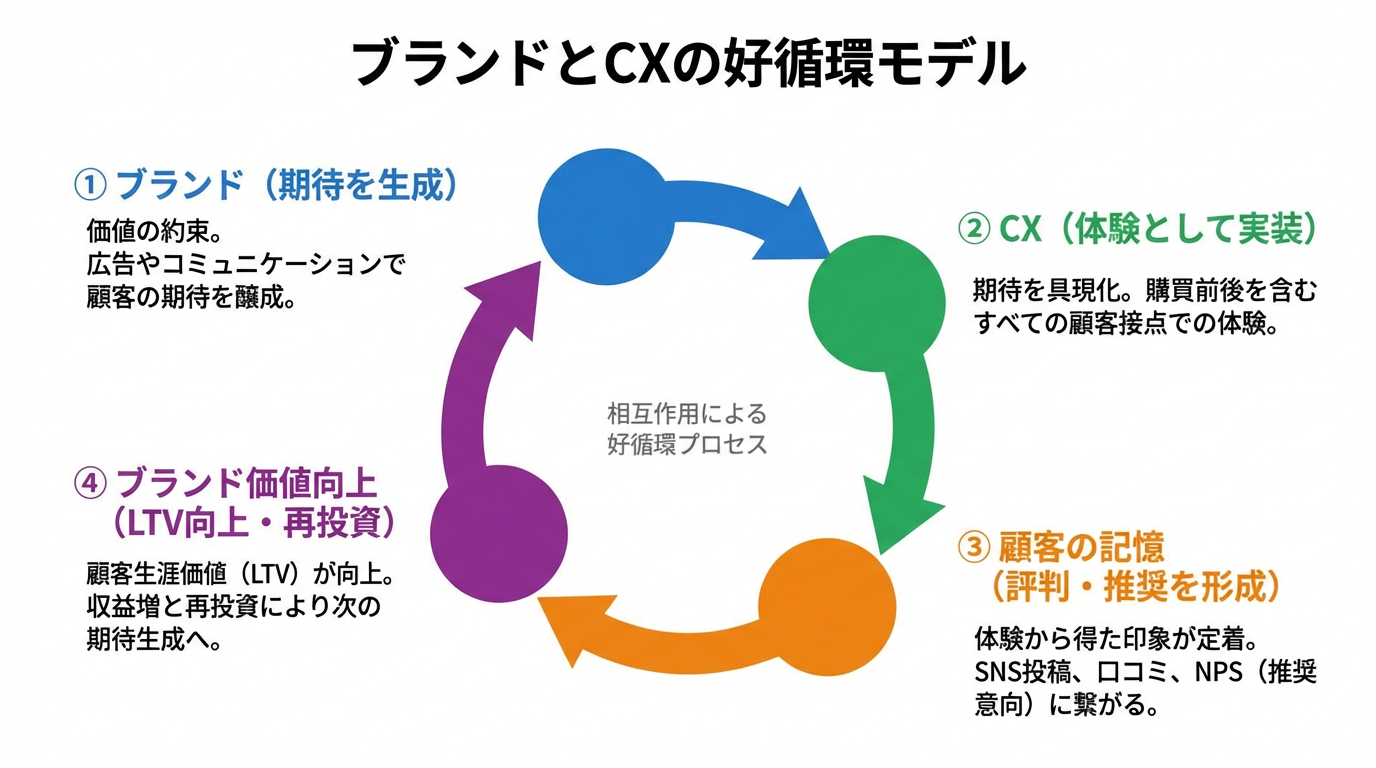 このブランドとCXの相互作用は、一方通行ではなく、価値を高め合う好循環を生み出します。その関係性を図にすると、次のようになります。
