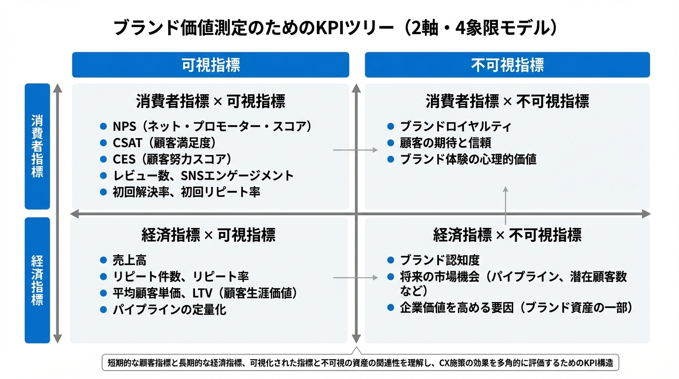 ブランドマネジメントの理論では、評価を多角的に行うため「経済/消費者」と「見える/見えない」の2軸で整理するアプローチが推奨されています。これをKPIツリーとして可視化すると、測定すべき指標の全体像が明確になります。