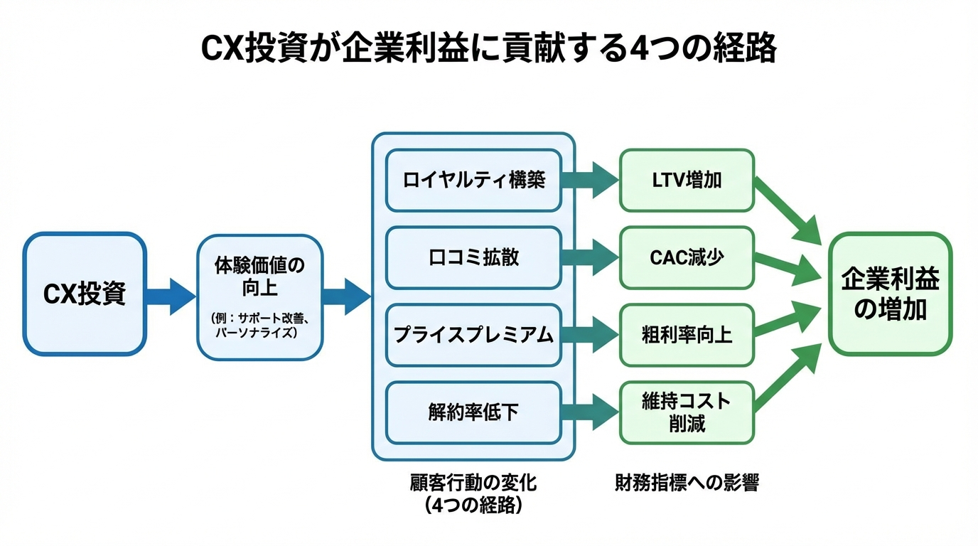 図で示すと、CX投資が4つの経路を通じて利益に変換されていく様子が分かりやすくなります。
