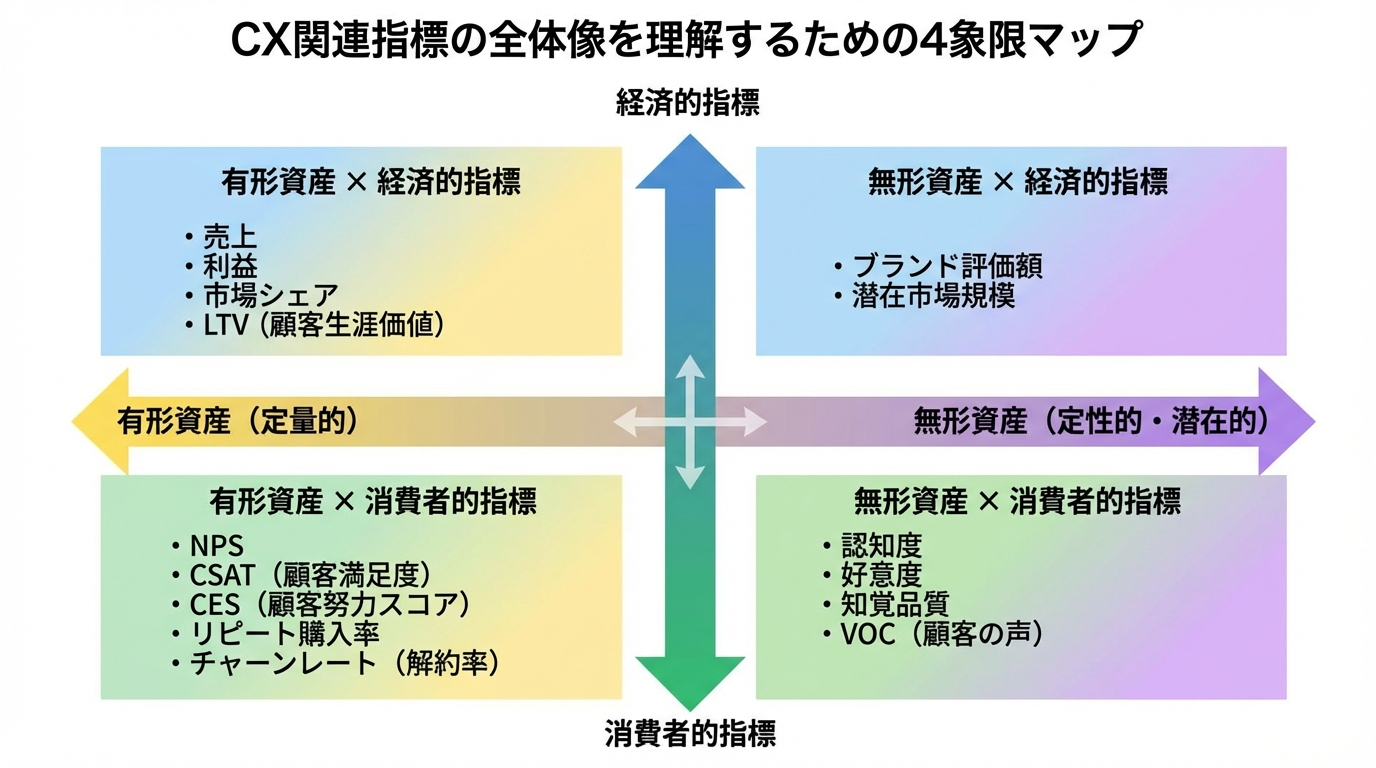 一般的なブランド評価の考え方では、経済指標と消費者指標、見える資産と見えない資産を統合して評価することが推奨されています。これをCXの指標に当てはめると、以下のように整理できます。