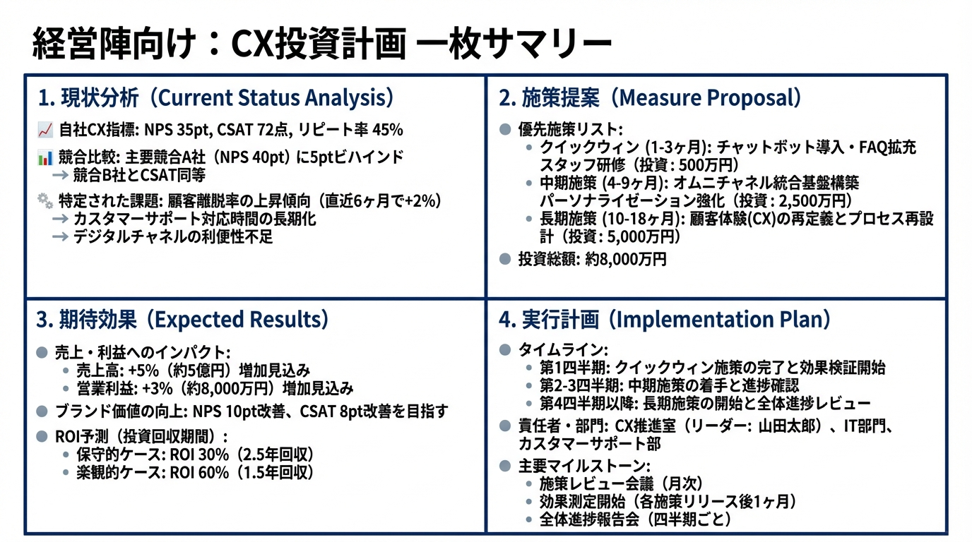 CXへの投資を経営層に承認してもらうには、彼らが重視する指標で語ることが不可欠です。この章では、提案書の構成と説得のポイントを整理します。