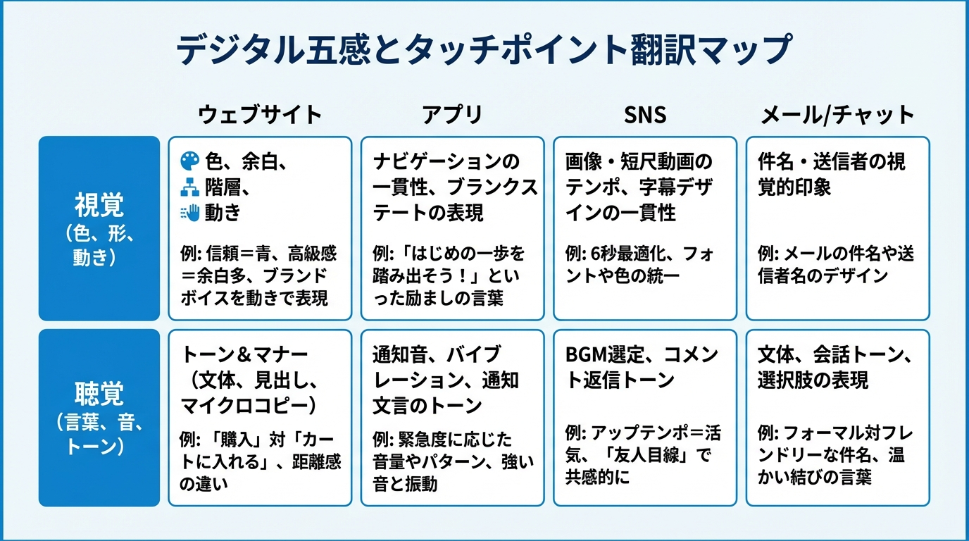 【図1】の翻訳マップで示したように、デジタルでブランド体験を設計する際、最も重要なのは「ブランドの約束を、視覚と聴覚でどう翻訳するか」という視点です。オンラインでは触覚・味覚・嗅覚が直接伝わらない分、視覚と聴覚に全体験が集中します。