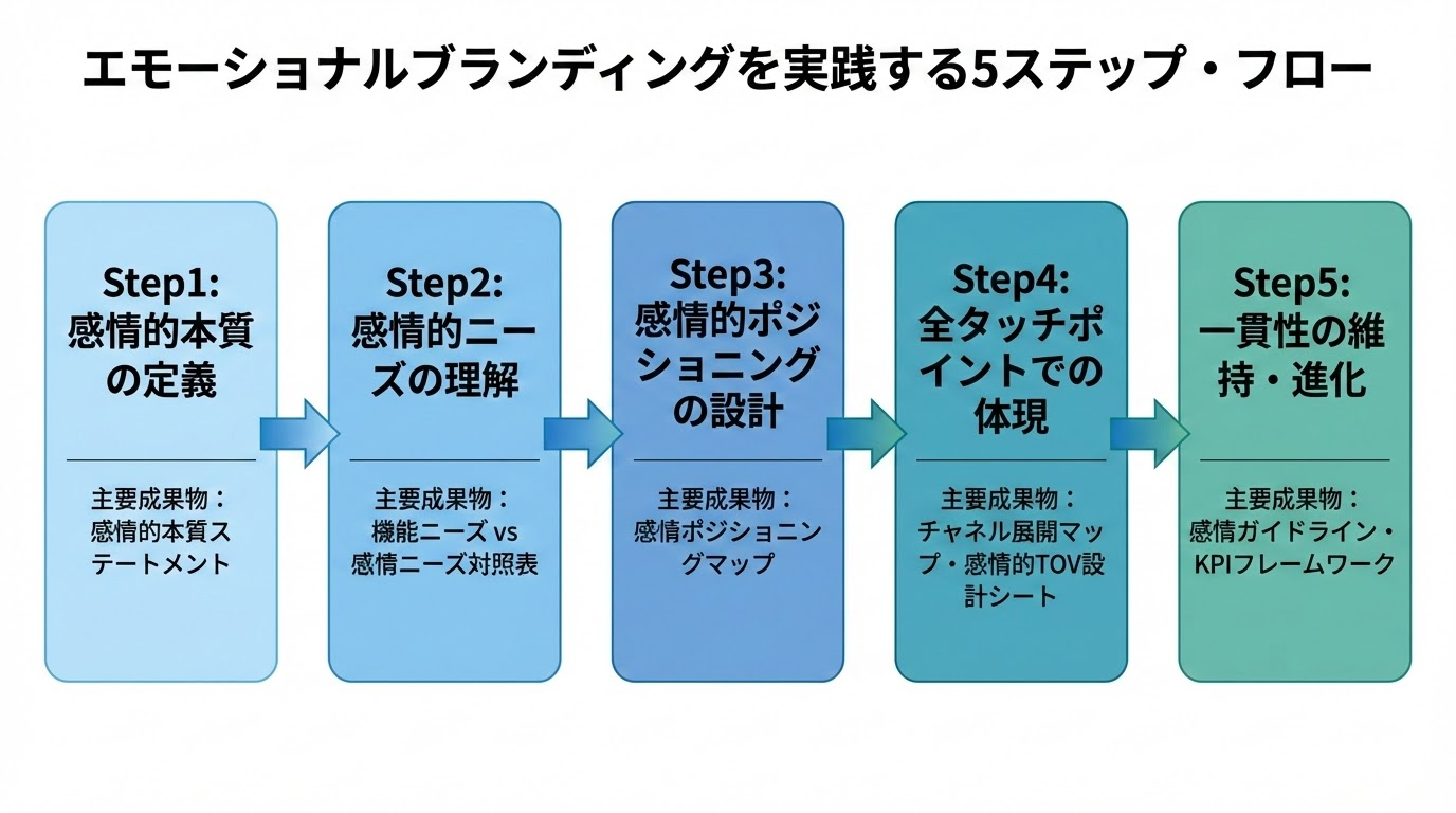 ここからは、エモーショナルブランディングを実際に構築するための5ステップを、具体的に解説します。各ステップには「目的」「やること」「成果物」「注意点」を明記していますので、自社での実装イメージを持ちながら読み進めてください。