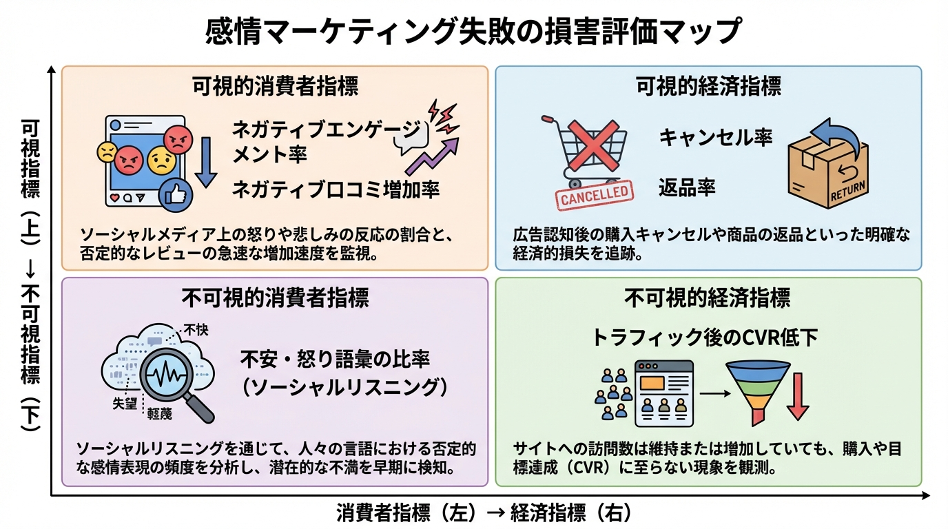 - 見える消費者指標としては、否定的エンゲージメント率や否定的クチコミの増分速度を追跡します。「いいね」よりも「怒り」や「悲しみ」のリアクションが急増していないか、ネガティブなコメントがどのような速度で増えているかを監視するのです。
