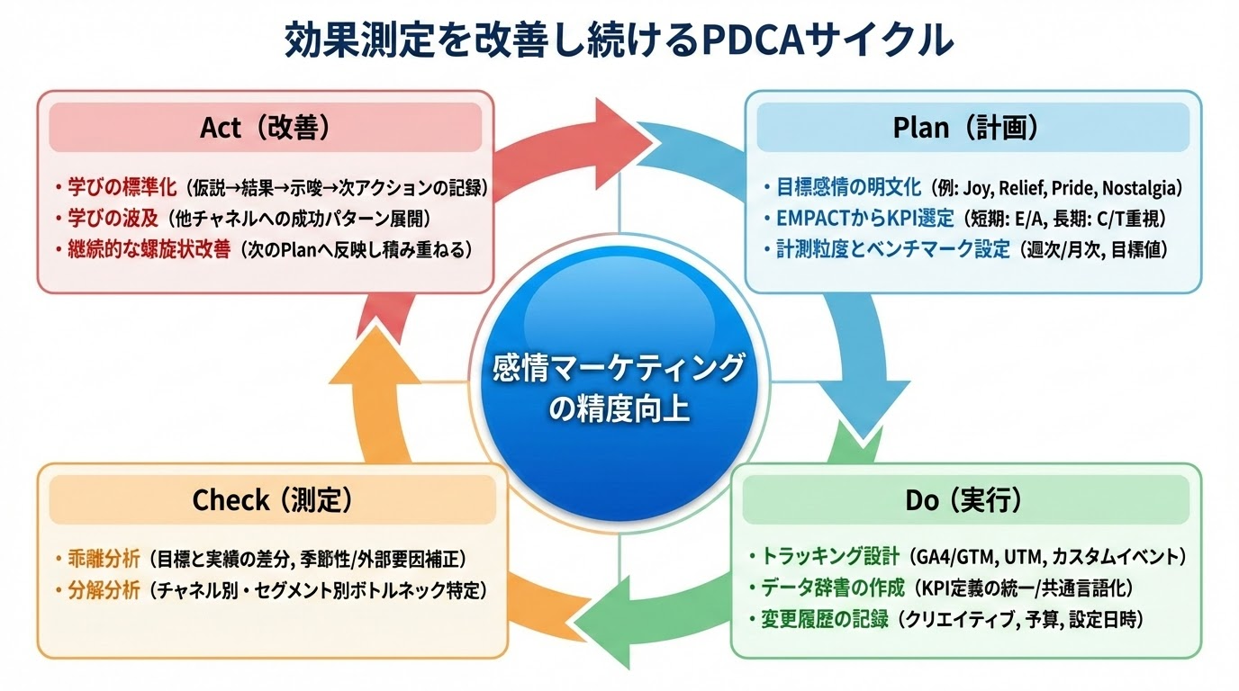 19年間、WEBマーケティングの現場で数値による説明責任を果たし続けてきた経験から言えるのは、「測れないものは改善できない」という原則は、感情マーケティングにも当てはまるということです。EMPACTフレームワークとPDCAサイクルを活用し、感情マーケティングを「投資に値する戦略」に昇華させましょう。