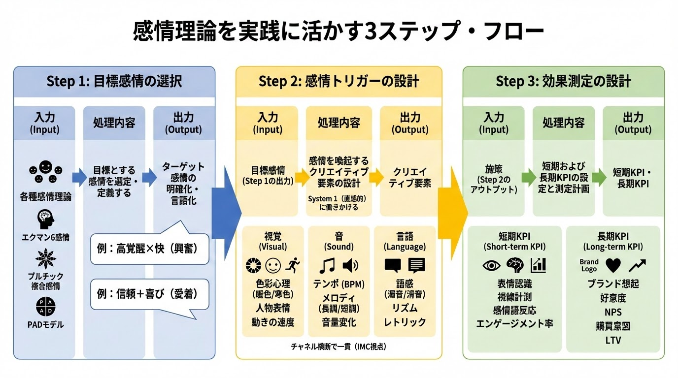 感情マーケティングは「なんとなく良さそう」ではなく、心理学・神経科学の学術研究に裏付けられた科学的アプローチです。本記事で解説した主要理論を整理すると、以下のようになります。