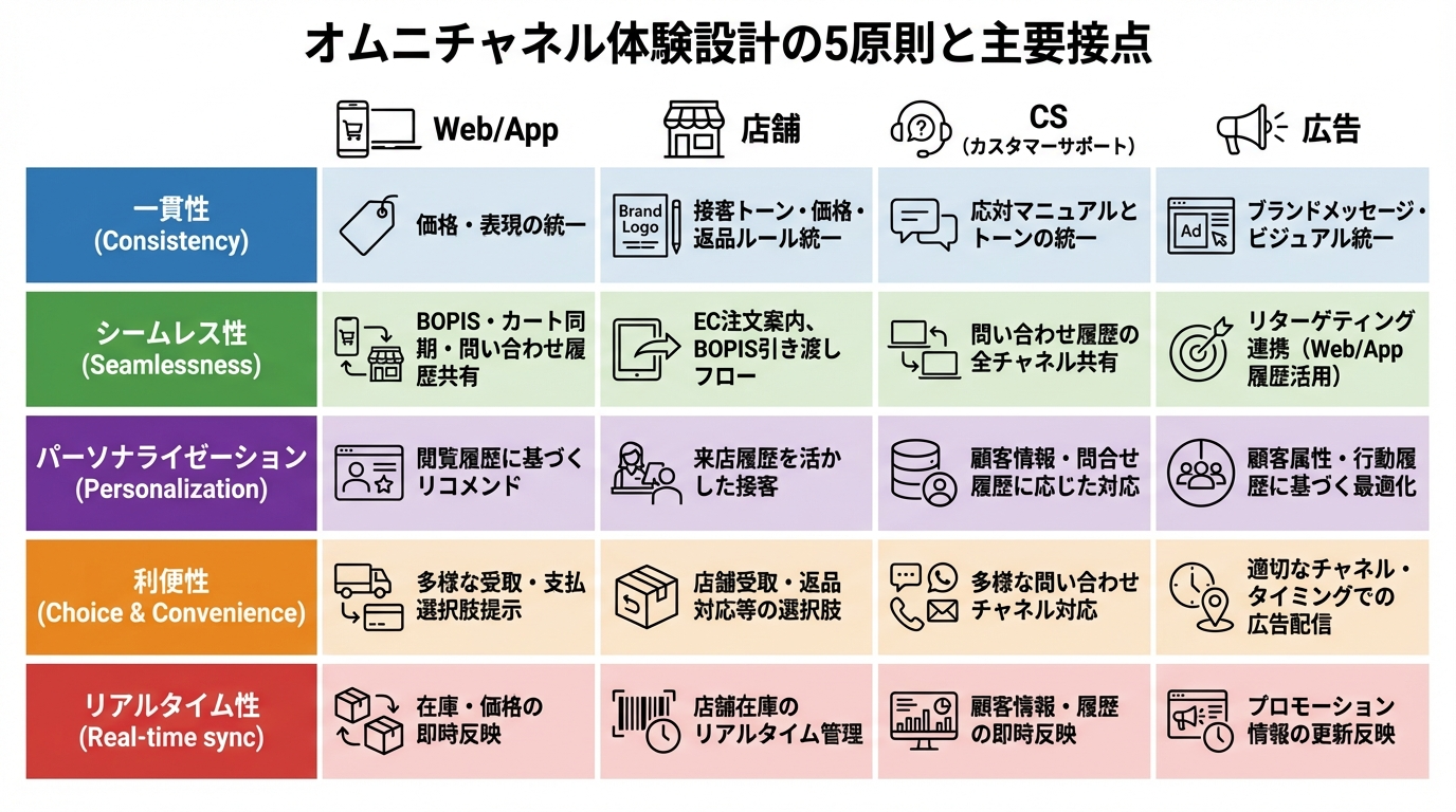 オムニチャネル体験を成功させる5つの原則があります。これらは理論ではなく、実務で検証された設計指針です。