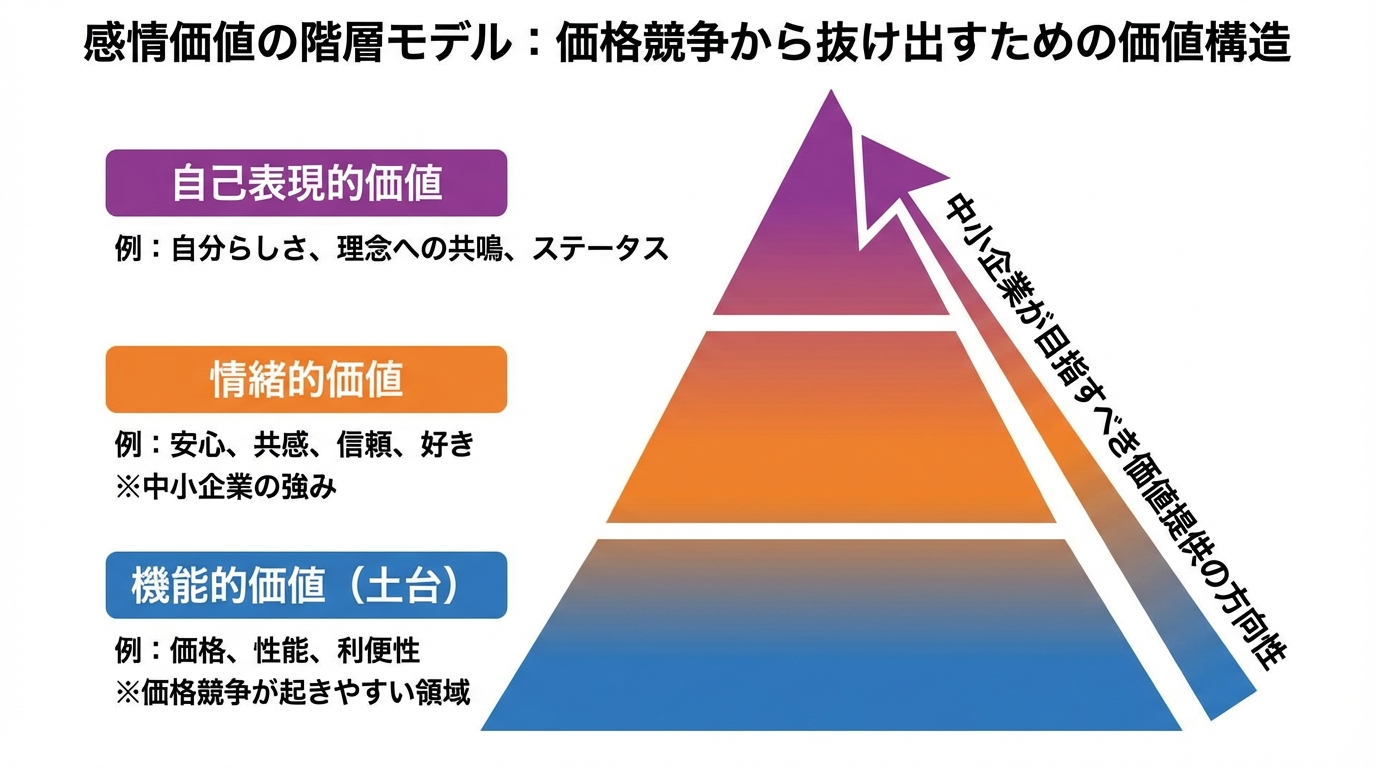 ここで重要になるのが、「好きで選ばれる」という状態を目指すことです。中小企業が価格競争から抜け出すには、単なる機能だけでなく、お客様の感情に訴えかける『情緒的価値』、さらにはお客様自身の価値観を反映する『自己表現的価値』を提供することが重要です。感情価値の階層モデルで、この構造を確認しましょう。
