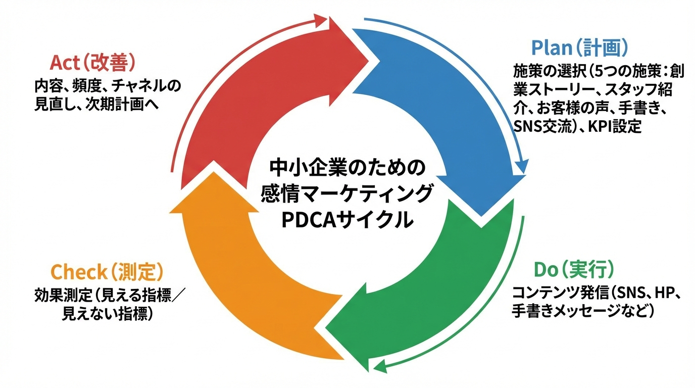感情マーケティングを「いつかやろう」で終わらせないために、具体的な実行計画を提示します。予算はゼロ円から微小で、中小企業の現場で無理なく実行できる設計です。大切なのは、計画を実行し、その結果を測定して改善し続けることです。この一連の流れを【図】感情マーケティングPDCAサイクルで確認しましょう。