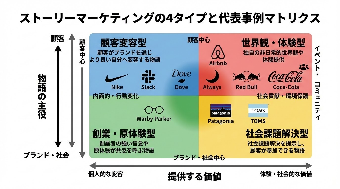 | 顧客変容型 | 顧客がブランドを通じて、より良い自分へ変容する物語 | 自己啓発、健康食品、フィットネス、コンプレックス解消型商材 | 体験談(UGC)、ビフォーアフター事例、インフルエンサー |
