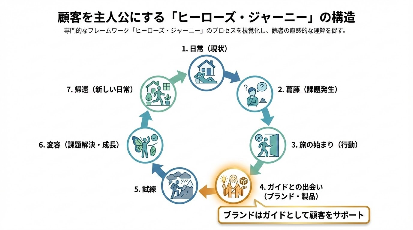 - 顧客を「主人公」にし、ブランドは「ガイド」に徹する: 顧客の感情的な葛藤に寄り添い、彼らがより良い自分へと「変容」する物語を描くことが、深い共感と行動を促します。