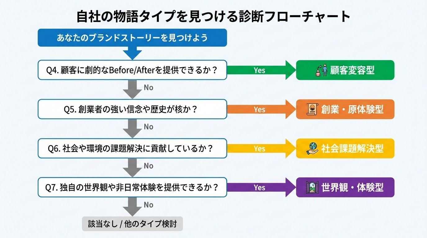 次に、Step1で棚卸しした要素をもとに、あなたのブランドに最も適した物語のタイプを診断してみましょう。先述の4つのタイプに照らし合わせて、最も核となるものを選んでみてください。
