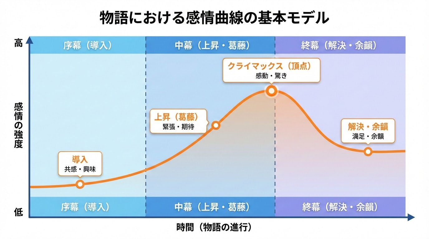 物語には感情の「波」があります。導入から始まり、上昇、クライマックス、そして解決へと流れる感情曲線は、古くはアリストテレスから、現代のハリウッド脚本術まで一貫して重視されてきました。