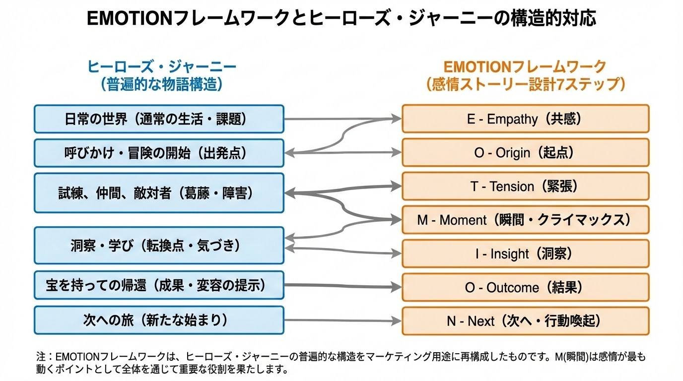 物語と感情を統合的に設計するために、当編集部では「EMOTION」という7ステップのフレームワークを整理しました。これは、ブランディング理論におけるターゲット理解(友達視点)、ストーリー要素、ブランドの約束と原則、統合コミュニケーションの知見を、実務で使いやすい形に再構成したものです。