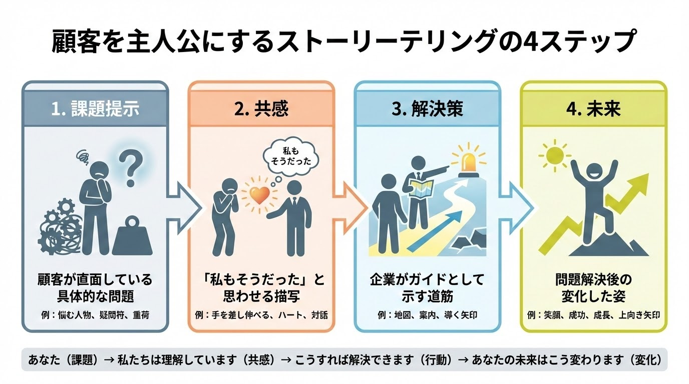 「押し付けがましい」ストーリーを避けるには、物語の構造そのものを顧客中心に設計し直す必要があります。次の図は、顧客を主人公に据えたストーリーの基本的な流れを示しています。