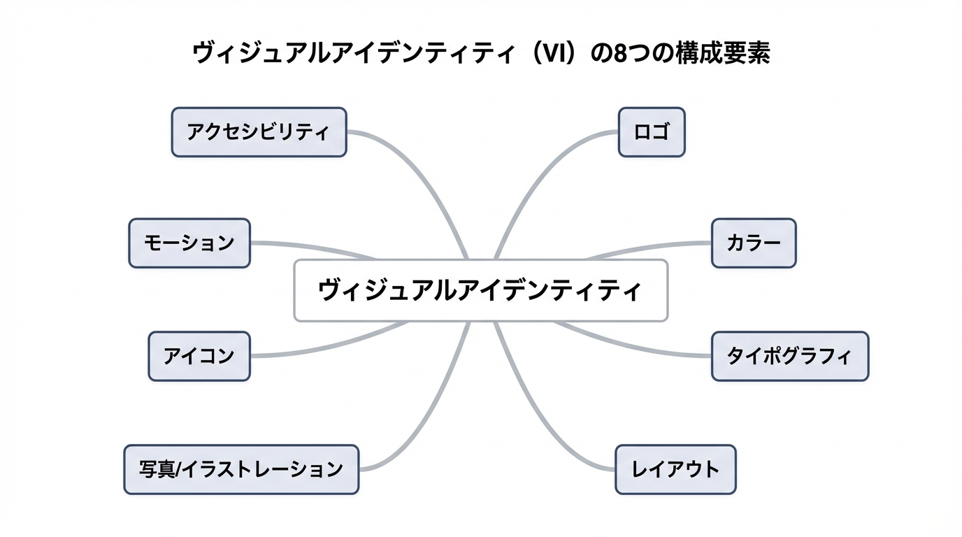 ビジュアルアイデンティティは、ロゴだけでなくこれら8つの要素が連携する「システム」です。以下の図で全体像を確認しましょう。