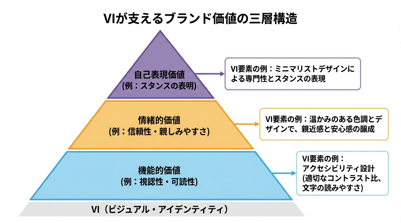 VIがブランド価値の三層構造をどのように支えているか、以下の図で整理します。