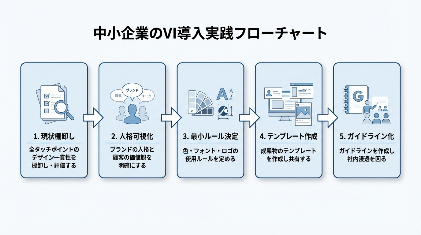 VI構築は、以下の5つのステップで進めるのが現実的です。まず、この全体フローを把握しましょう。