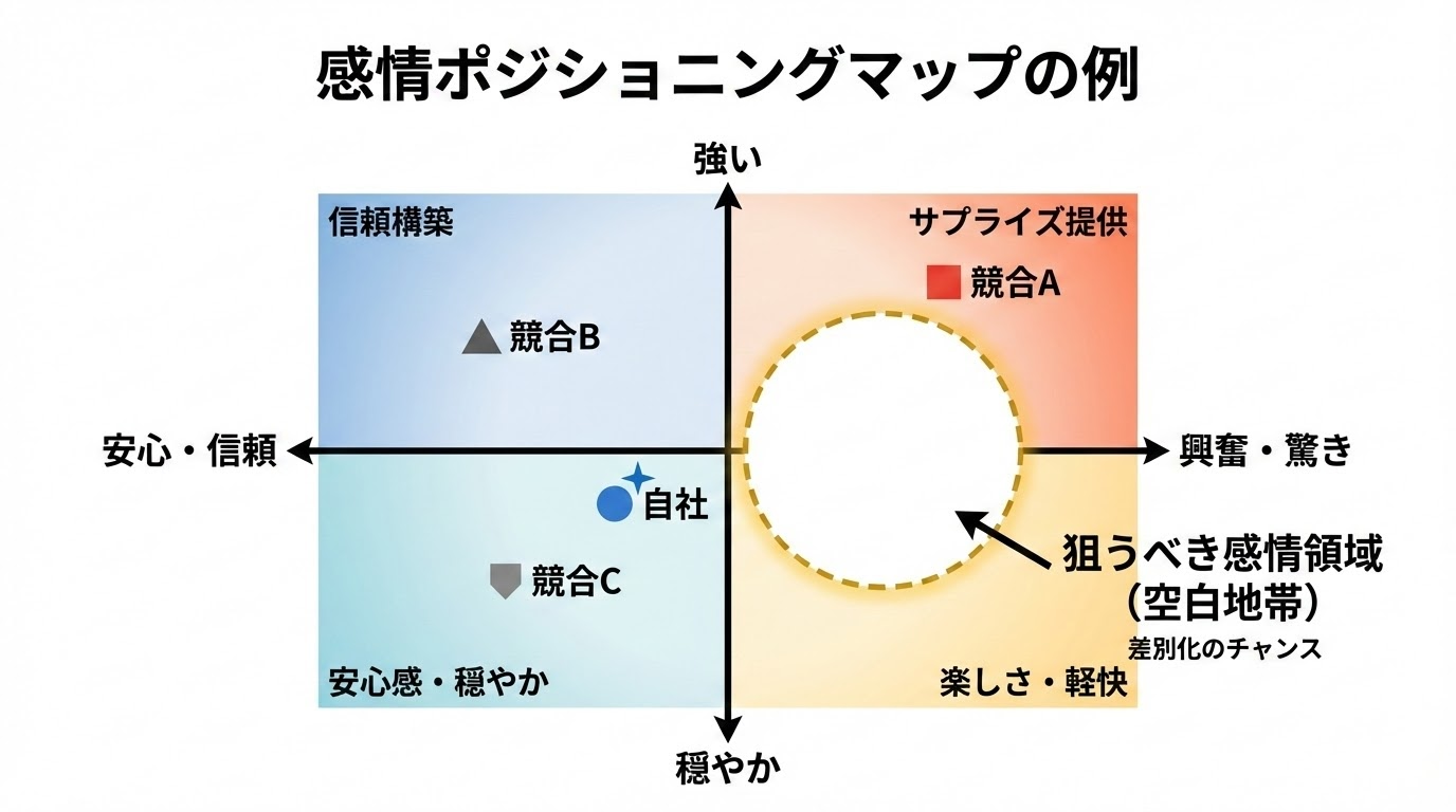 レビュー、SNS、問い合わせから、顧客が使う感情表現をメモしましょう。「助かった」「嬉しい」「安心した」——その裏にある本質的なニーズが見えてきます。 - 今週:競合の感情訴求をマッピング