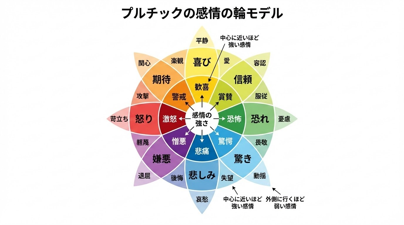 第2章ではエクマンの6つの基本感情を紹介しましたが、より nuanced(繊細な)感情設計を行うために、心理学者ロバート・プルチックが提唱した「感情の輪」というモデルも有効です。これは8つの基本感情(喜び、信頼、恐れ、驚き、悲しみ、嫌悪、怒り、期待)と、それらが混ざり合うことで生まれる応用感情(例:喜び+信頼=愛)を視覚的に示したものです。