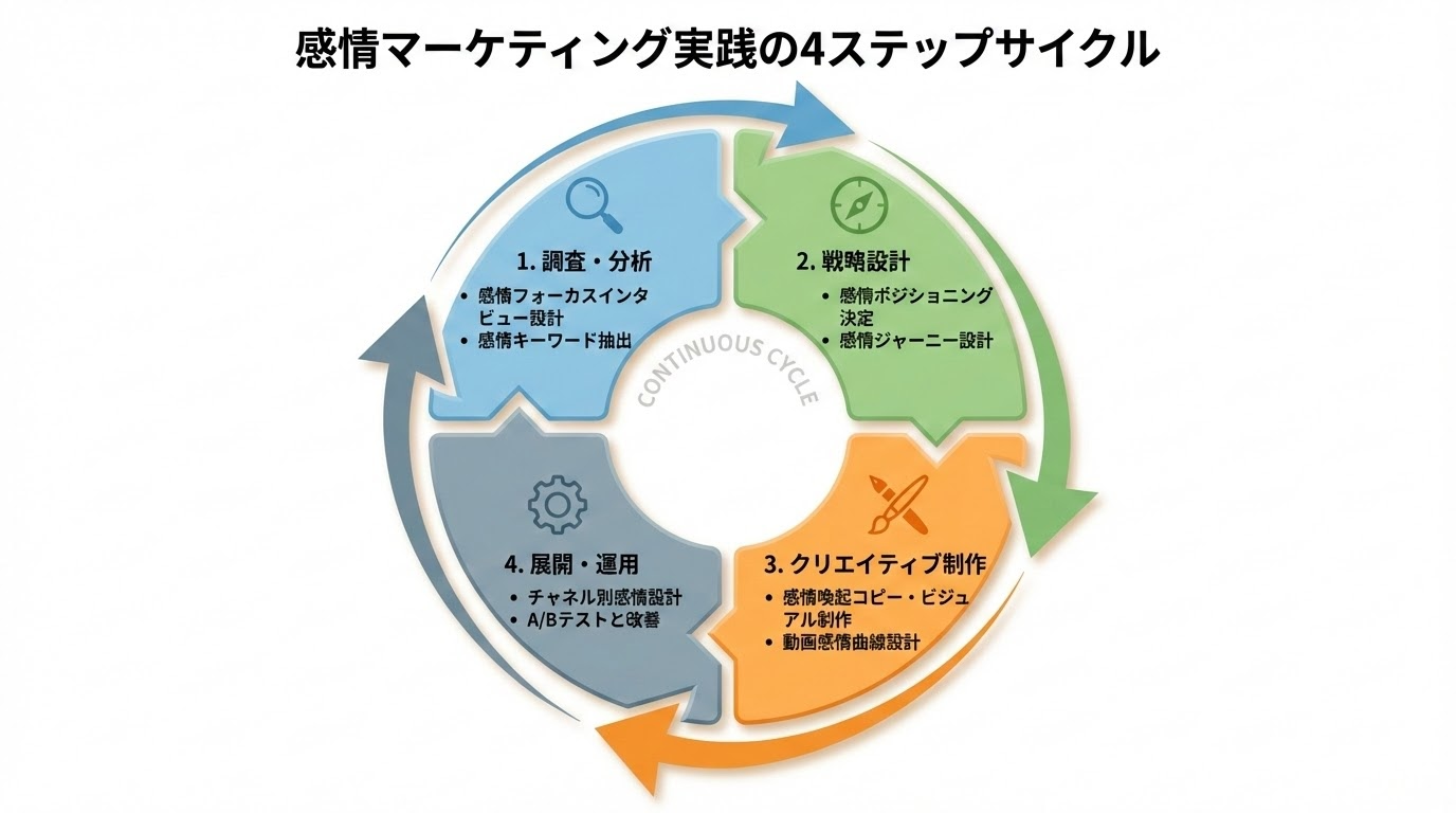 重要なのは、単に数字を見るだけでなく、「なぜその感情訴求が効いたのか」を考察すること。仮説を立て、検証し、学びを次に活かす——このサイクルが感情マーケティングの精度を高めます。